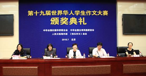2018年7月21日上午,由中國僑聯、全國臺聯、人民日報海外版和《快樂作文》雜志聯合主辦的第十九屆世界華人學生作文大賽頒獎典禮在北京舉行,中國僑聯副主席康曉萍出席并致辭。來自中國、德國、美國、荷蘭、日本、比利時、加拿大等國家的百余名獲獎師生代表歡聚一堂,共賞美文佳作,感受華文魅力。