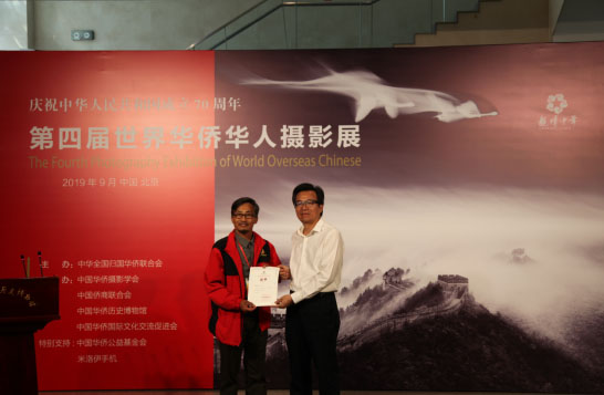 (中國僑聯顧問、中國華僑攝影學會會長王宏、攝影展支持單位米諾伊手機董事長盧寒為佳作獎獲得者代表頒獎)