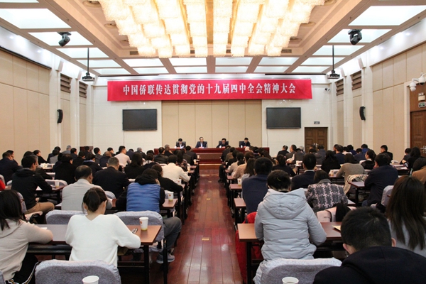 11月14日上午,中國僑聯召開全體干部大會傳達學習黨的十九屆四中全會精神。中國僑聯黨組書記、主席萬立駿主持會議,傳達了黨的十九屆四中全會盛況和《中共中央關于堅持和完善中國特色社會主義制度 推進國家治理體系和治理能力現代化若干重大問題的決定》(以下簡稱《決定》)精神。中國僑聯黨組成員、副主席隋軍傳達學習《關于〈中共中央關于堅持和完善中國特色社會主義制度 推進國家治理體系和治理能力現代化若干重大問題的決定〉的說明》,副主席李卓彬、齊全勝出席會議。