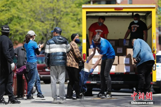 資料圖:一個公益組織在紐約市皇后區一個居民區發放免費的500份餐食,民眾排隊領取。疫情期間,紐約市公立學校等地點都會有免費餐食發放。中新社記者 廖攀 攝