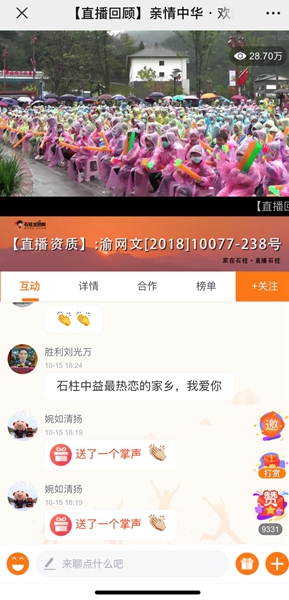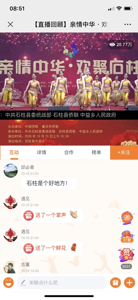 “感謝僑聯為老百姓帶來的文化盛宴!”“家鄉的老百姓太有福氣了!”“規格高、效果好、意義重大!”……除了現場觀眾一片叫好,15日的演出還在石柱生活網全程直播,吸引28.71萬人次的觀看量,網友刷屏點贊,其中不乏石柱籍的海外僑胞。