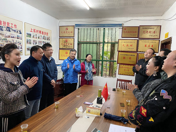 18日演出結束之后,“親情中華”藝術團的藝術家們還來到周臻揚生活工作的村委會辦公室,專門為他送上一曲深情的《我和我的祖國》?吹睫k公室墻上掛滿的一張張工作照以及一塊塊獎牌,藝術家們由衷地為這名年輕的掛職扶貧干部點贊鼓掌。