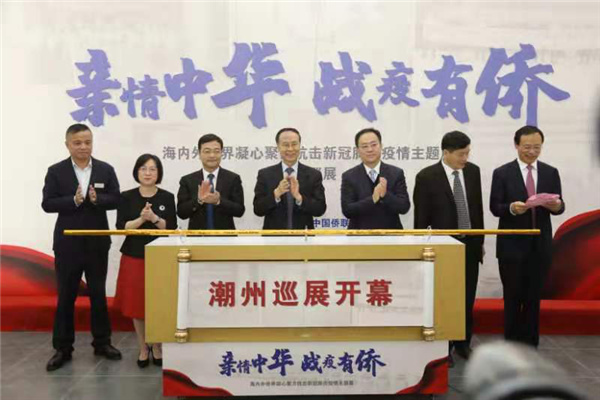 “親情中華·戰疫有僑——海內外僑界凝心聚力抗擊新冠肺炎疫情主題展”由中國僑聯主辦,10月16日在北京首展。12月10日,該主題展潮州巡展開幕式在潮州市陳偉南文化館舉行,中國僑聯黨組書記、主席萬立駿,副主席齊全勝,中國僑聯副主席、廣東省僑聯黨組書記、主席黎靜,潮州市委副書記、市長何曉軍,潮州市政協主席李堯坤等出席,潮州市援鄂醫療隊隊員、潮州市僑聯青年志愿者代表、僑聯干部和僑界群眾代表等參加。