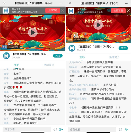 闔家團圓除舊歲,全球共迎中國年。由中國僑聯主辦的“親情中華·同心與共”2021華僑華人云端春節晚會于2月9日下午16:00通過“學習強國”學習平臺、人民視頻、中國網、央視頻、CCTV+及新浪微博、西瓜視頻、華人頭條、CIBN互聯網電視等網絡平臺播出,在海內外僑界引起熱烈反響。據統計,截止2月9日21:00,網絡觀看量累計達2403.5萬人次。