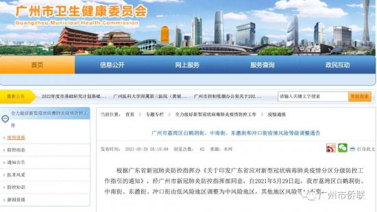5月29日,廣州市荔灣中風險地區達6個,白鶴洞街、中南街、東漖街、沖口街由低風險地區調整為中風險地區,鶴園小區東片(5月26日調整)、龍津街錦龍匯鑫閣(5月22日調整)為中風險地區,其余地區為低風險地區。