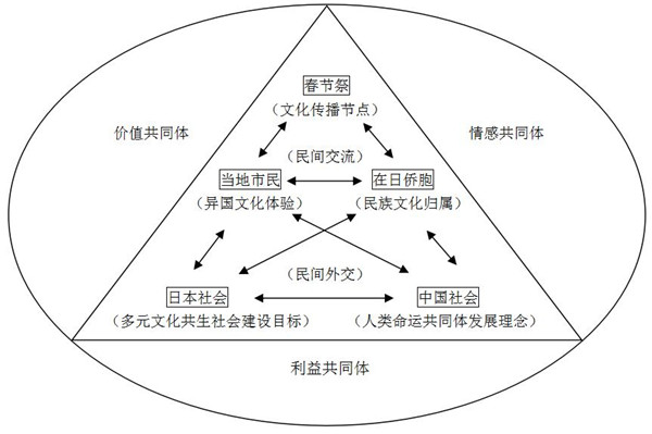 圖1是筆者構思的“春節祭品牌共同體模型”。文中的“品牌共同體”,區別于傳統地理意義上的地域型社區和市場營銷學中的消費社群,而是體現了“圍繞某一品牌(春節祭品牌)形成的人與人(在日僑胞與當地市民)、人與群體(在日僑胞與日本主流社會、當地市民與中國社會)、群體與群體(日本社會與中國社會)之間相互聯系、相互影響、相互作用的共同體(命運共同體)”的含義;微觀情境的相互關聯(中日民眾的民間交流)構成宏觀模式(中日兩國的民間外交)。春節祭品牌共同體得以實現也體現了日本多元文化共生社會建設目標與人類命運共同體發展理念的有機統一。