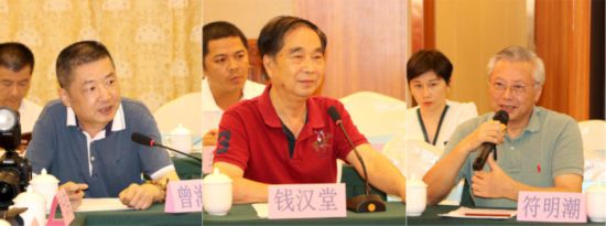 省海歸協會會長管月暉(左),美國海南商貿總會執行主席許志明(中),?谑心蟽S機工眷屬聯誼會會長羅長英(右)在座談會上踴躍發言