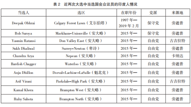 首先,當選人數創歷史新高,二者“代表權鴻溝”凸顯。2015年,有21名印度人當選國會議員,占少數族裔議員總數的45%和全部國會席位的6.2%。2019年,當選人數增至22名,占國會席位的6.5%,呈現“超比例代表權”的特征(見表2)。其中,4 位被提名為部長,職位最高的當屬國防部長石。℉arjit Sajjan)。華人也積極投身于選舉之中,2019年,有8名候選人當選,較上屆多出2人,創造了華人參政的新紀錄。與以往相比,華人參政出現可喜變化。然而,華人參政水平與其人口規模和經濟實力仍不相稱,如果按人口比例計算,加拿大國會中至少應有17名華人議員,目前連一半都不到!皟乳w中偶爾涌現的個別華人部長,多是政黨勝出的大勢和內閣多元比例要求的結果,在邊緣化位置上難以有所作為!