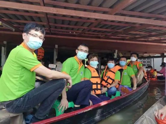 泰國泉州晉江聯合總會會長蔡上新、執行會長陳俞龍、副會長許清流、洪世界、張孚杰、常務理事黃淑芬、顧問許宗會乘小船進入災區
