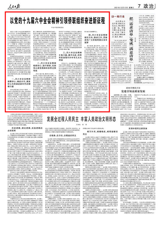 黨的十九屆六中全會是在重要歷史關頭召開的一次具有里程碑意義的大會。習近平總書記發表了重要講話,會議審議通過了《中共中央關于黨的百年奮斗重大成就和歷史經驗的決議》!稕Q議》突出強調的“兩個確立”是黨的十八大以來最重要的政治成果,《決議》提出的“十個明確”進一步概括了習近平新時代中國特色社會主義思想的核心內容,會議系統總結了黨帶領人民創造的偉大成就和十個方面的經驗,發出了以史為鑒、開創未來,奮斗新時代、奮進新征程的動員令,在海內外僑界引發熱烈反響和強烈共鳴。