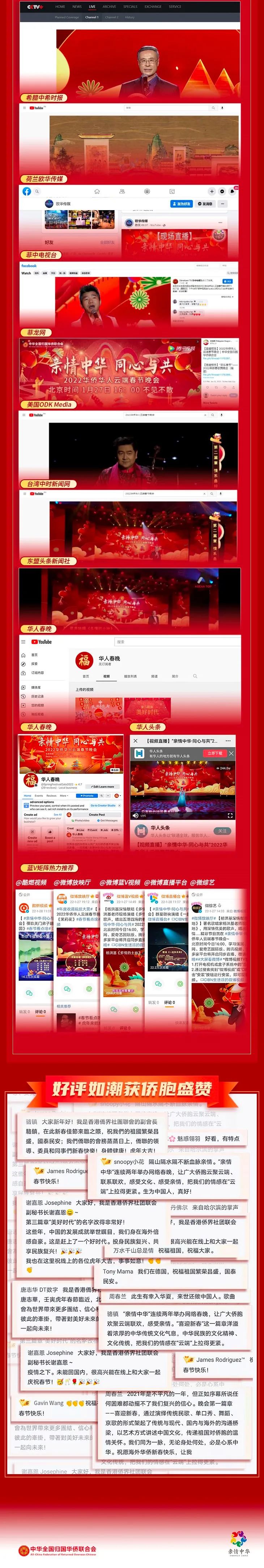 晚會在海內外僑界引發熱烈反響、好評如潮,認為晚會緊扣僑胞精神需求,年味、僑味十足,節目設計獨具匠心、精彩紛呈,傳遞出祖(籍)國對僑胞的惦念、關愛,激勵海內外中華兒女團結一心、攜手向前,共創美好未來,F將部分僑胞的感想感言選登如下: