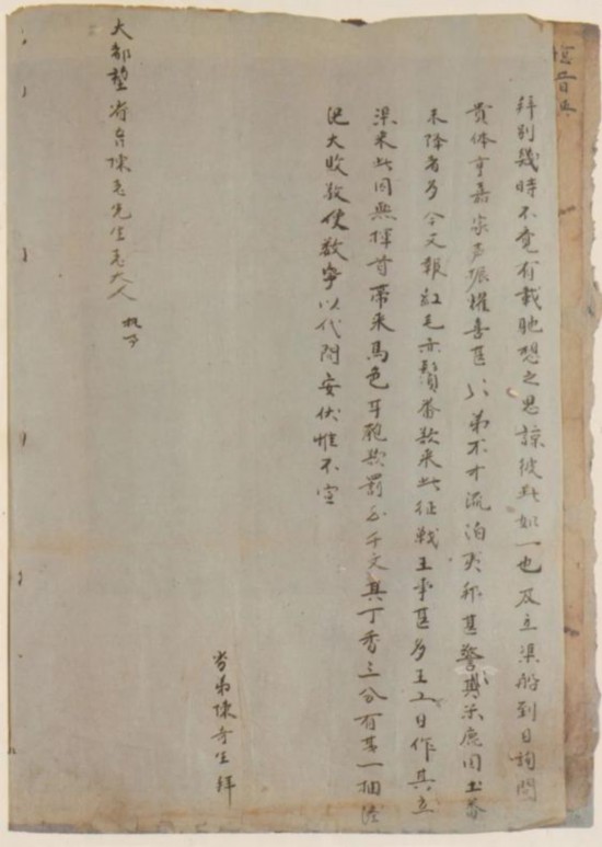 拜別幾時,不覺有載,馳想之思,諒彼此如一也。及立渠船到日詢問,貴體亨嘉、家聲振耀,喜甚。弟不才,流泊夷邦,甚警。行(?)其米鹿國,土番未降者多,今又報紅毛赤須番欲來此征戰,王事甚多,王工日作,其立渠來此,因無揮首,帶來馬色耳匏,欲罰身千文,其丁香,三分有其一抽,經紀大敗。敬便數字,以代問安,伏惟不宣。