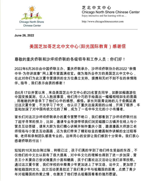 本次活動效果突出,得到參營單位、營員及家長們的一致好評。美國芝加哥芝北中文中心發來感謝信表示:“當地小營員紛紛沉浸中國故事里,這次活動讓小營員受益匪淺,他們的中文水平有了很大提高,對中國文化理解也進一步加深。學校的華裔青年更加迷上了學漢語、說中文,青少年們和祖(籍)國的距離變得更近了!钡聡o導員秦曙光表示:“此次課程內容豐富,極具特色。孩子們游覽了重慶的歷史文化和自然景觀,共賞了‘三峽庫心 ·長江盆景’的美好畫卷,學習了漢服中所蘊含的中華禮儀文化,同時大家還體驗了制作著名的土特產‘忠縣豆腐乳’。期待疫情后到重慶旅行,看山看水品美食,感受中華傳統文化之魅力!比A裔青少年們紛紛表示,此次網上營進一步加深了大家心底的文化自信心和民族自豪感,雖然活動結束了,他們學習中華文化的腳步還會繼續,一定會做好中華文化的忠實傳播者和中外文化交流的友好使者。