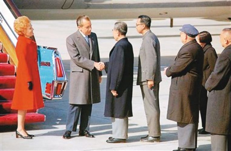 1972年,美國總統尼克松訪華,周恩來總理到機場迎接,冀朝鑄(左四)擔任翻譯。