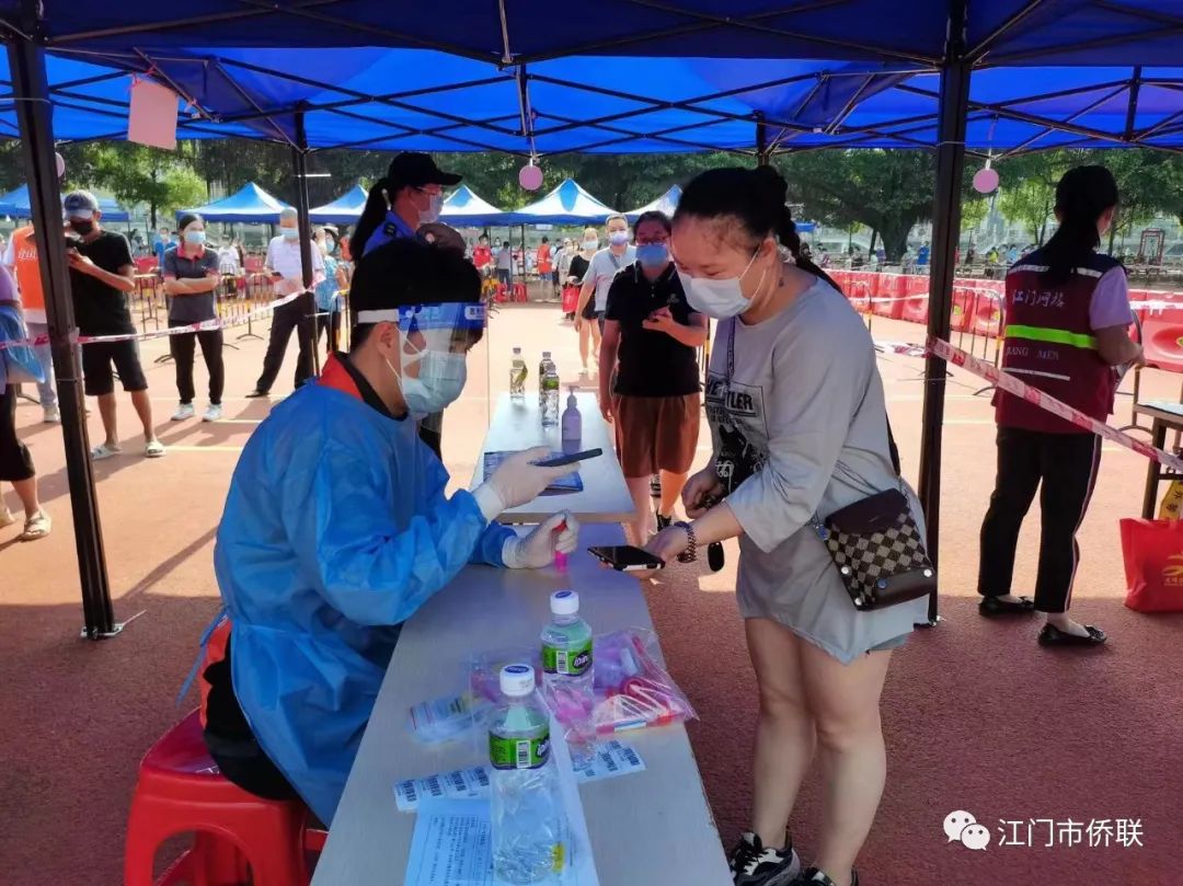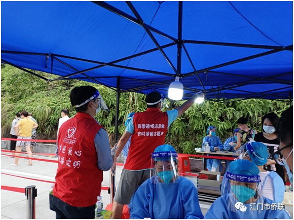 新會區僑聯所有黨員干部、工作人員聞令而動、迅速響應,立即前往中心影劇院前小廣場、河南社區核酸檢測點進行支援。黨員干部、工作人員換上防護服、戴好防護裝備,各司其職,堅守崗位,協助醫護平穩有序地進行核酸檢測工作。