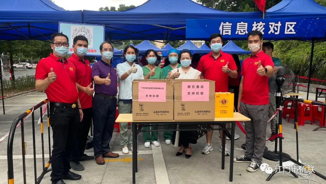 9月7日,港資企業五盞湯會所法人劉素瓊向蓬江區豐雅社區核酸檢測點一線防疫人員捐贈防疫湯料包一批,為江門早日戰勝疫情貢獻僑界力量。