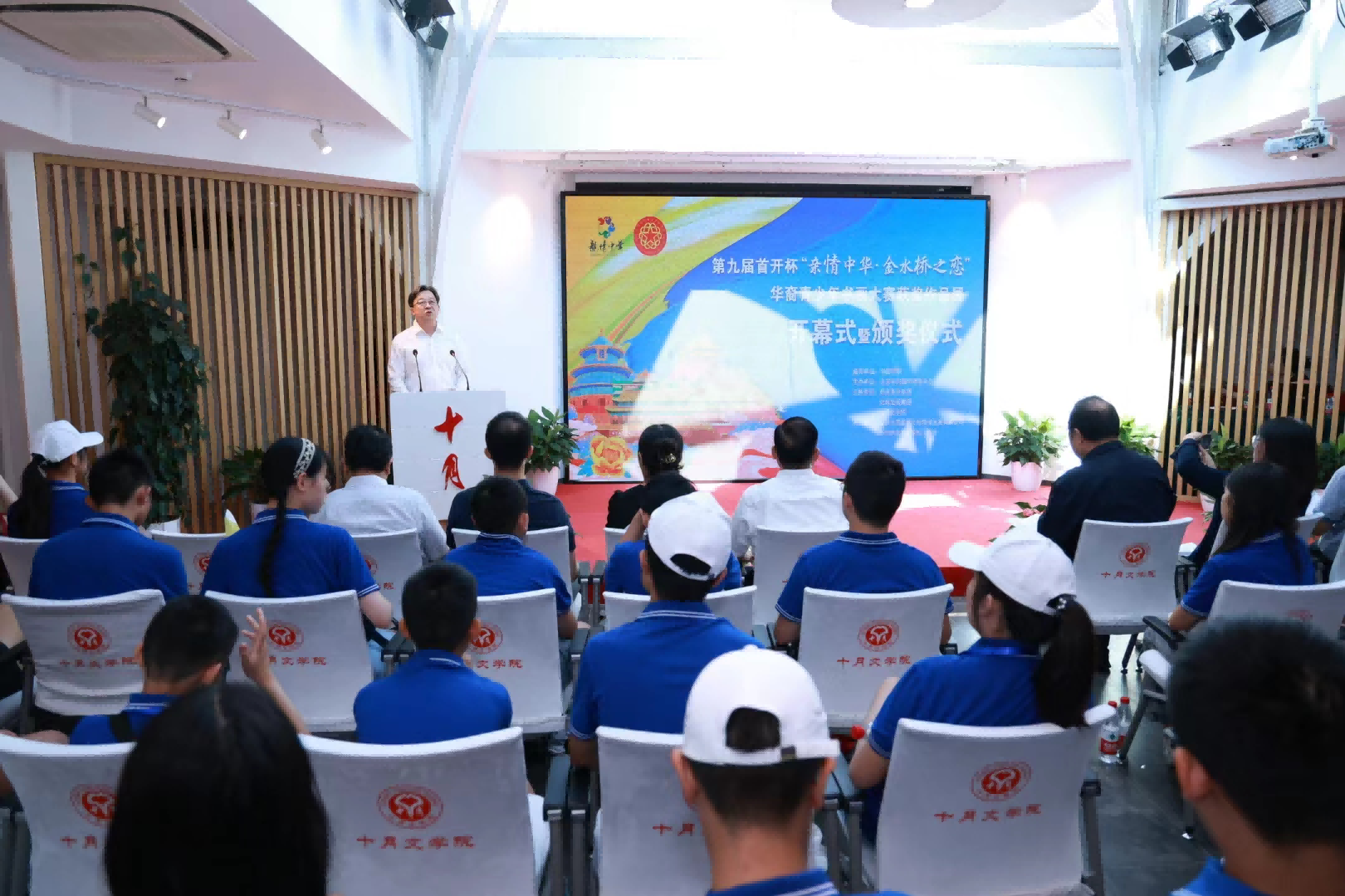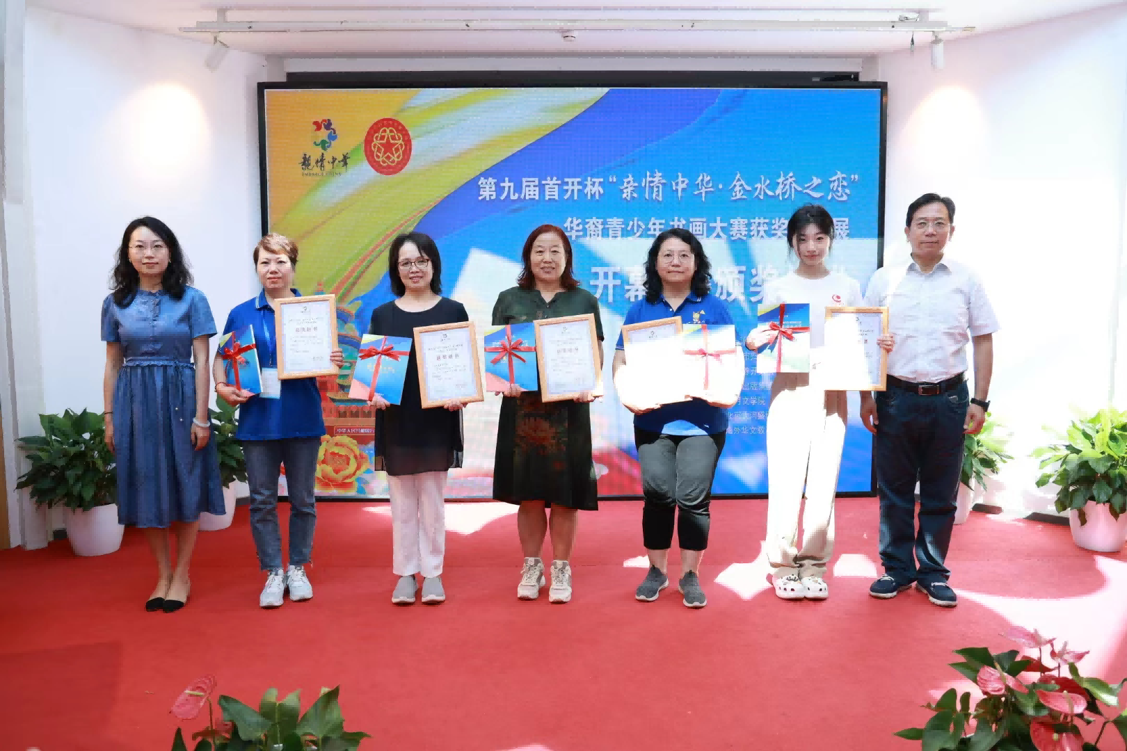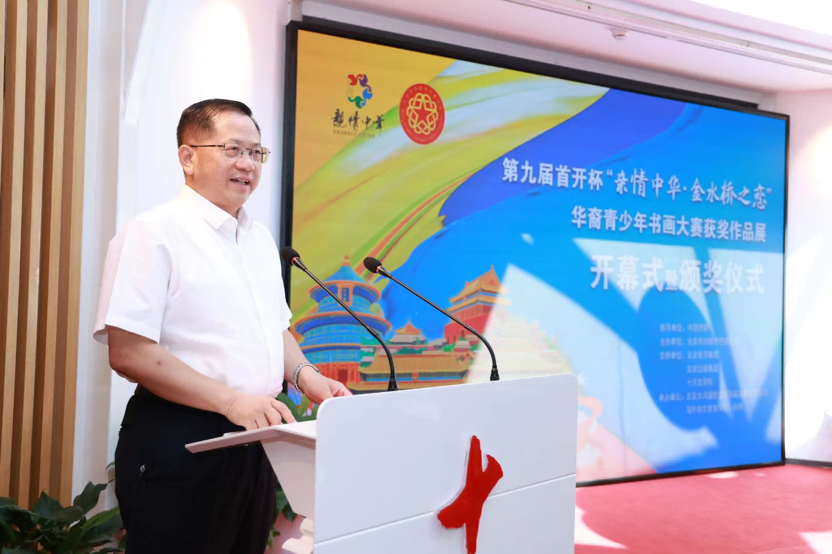 7月25日,第九屆首開杯“親情中華·金水橋之戀”華裔青少年書畫大賽獲獎作品展開幕式暨頒獎儀式,在北京中軸線南端、永定門城樓旁十月文學院隆重舉辦。中國僑聯文化交流部部長劉奇,北京市僑聯黨組書記嚴衛群,北京首開集團黨委副書記李曉莉,中國國畫研究院、濟南大學美術學院院長陳忠洲,北京出版集團十月分公司總經理助理文爽,北京大河盛世文化傳媒發展有限公司董事長何雷以及書畫大賽獲獎代表,“中國尋根之旅”夏令營北京朝陽營、海淀營營員參加。北京市僑聯黨組成員、副主席蘇泳主持儀式。