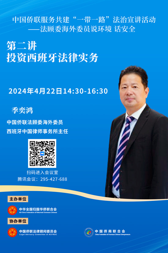 第二講將于4月22日下午14:30開始,由中國僑聯法顧委海外委員、西班牙律師季奕鴻主講。