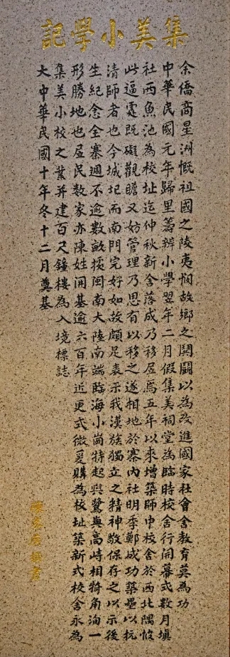 “教育為立國之本,興學乃國民天職。教育不振則實業不興,國民之生計日絀……”陳嘉庚紀念館里懸掛的這些話語,是昔日陳嘉庚常提起的。1911年辛亥革命成功,陳嘉庚備受鼓舞,“思欲盡國民一分子之天職”。次年,他回到家鄉。村中孩童衣不蔽體、成群失學、嬉游賭博的情景刺痛了他,更堅定了他興學辦校的信念;剜l第二年,陳嘉庚創辦了集美小學,F在,紀念館還保留著他當年寫的集美小學記。
