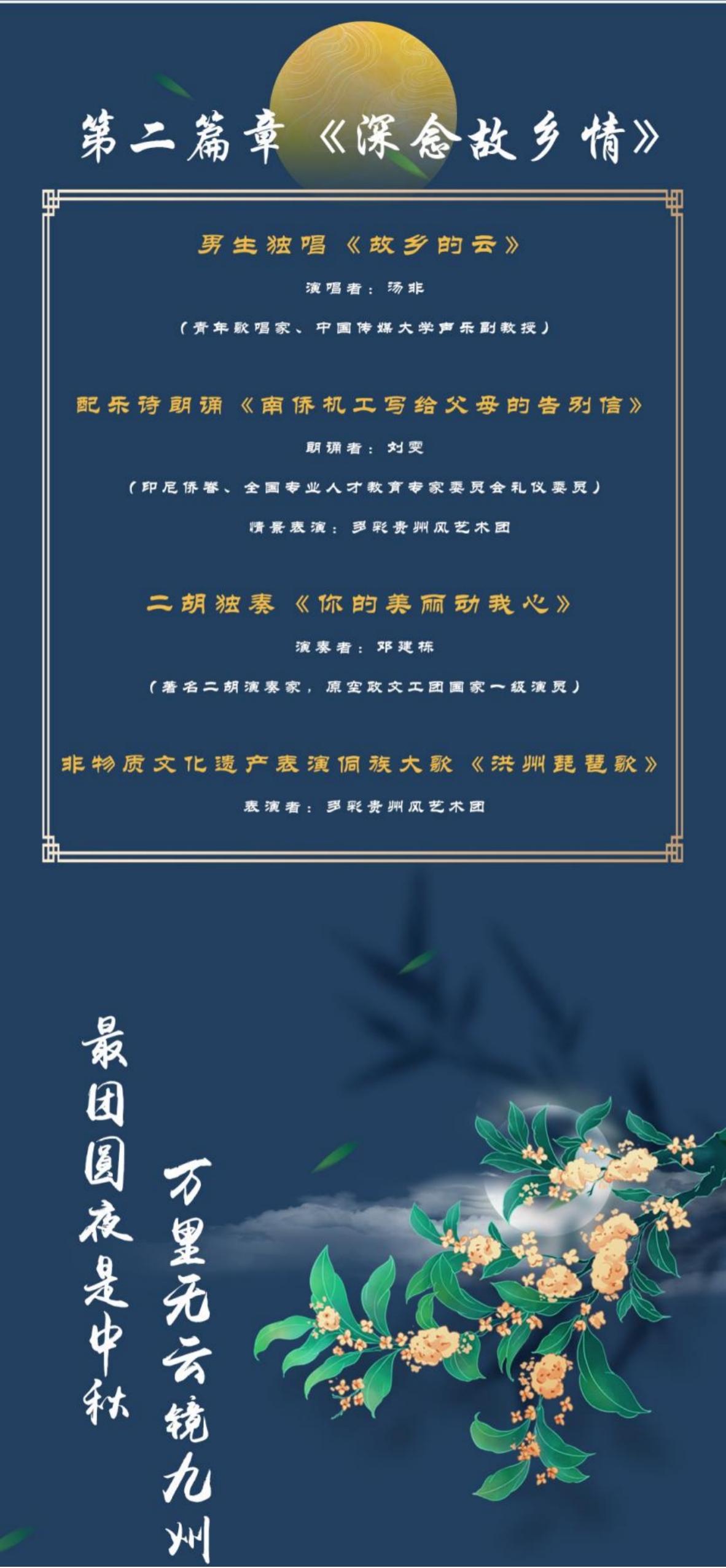 明天北京時間16時,“親情中華·月是故鄉明”全球華僑華人慶中秋聯歡會正式上線,屆時將通過人民日報海外網、中國日報社海外平臺、華人頭條、貴州省國際傳播中心抖音號、貴州4頻道、動靜新聞客戶端、百姓關注客戶端等海內外媒體平臺同步播出。
