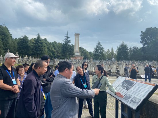 英魂無言,松濤陣陣。在松山抗戰遺址,采訪團一行向抗戰英烈敬獻鮮花,懷著激動的心情探訪了目前保存最為完好的二戰戰場遺址。松山戰役紀念碑前的中國遠征軍雕塑群由老兵方陣、娃娃兵方陣、炮兵方陣等13個雕塑方陣402座雕塑組成,古榕樹上還保留著當年的彈孔,向今天的人們訴說著當年戰役的慘烈?!拔以趨⒂^中國遠征軍雕塑群時,巧遇一名穿著粉色衣服的女孩穿梭于娃娃兵方陣里,給塑像手里塞糖果。我看到在龐大的方陣里,塑像的手里、腳下,甚至是‘槍托’里,都塞滿了五顏六色的糖果和零食。我想,這包含的不僅是人們對抗戰英雄們的緬懷,更多的是心疼,他們用最直接和最質樸的行動在訴說著和平年代的人們對這些先烈們的感激之情?!辈稍L團成員、尼日利亞西非統一商報副社長王淑華感動地說道。