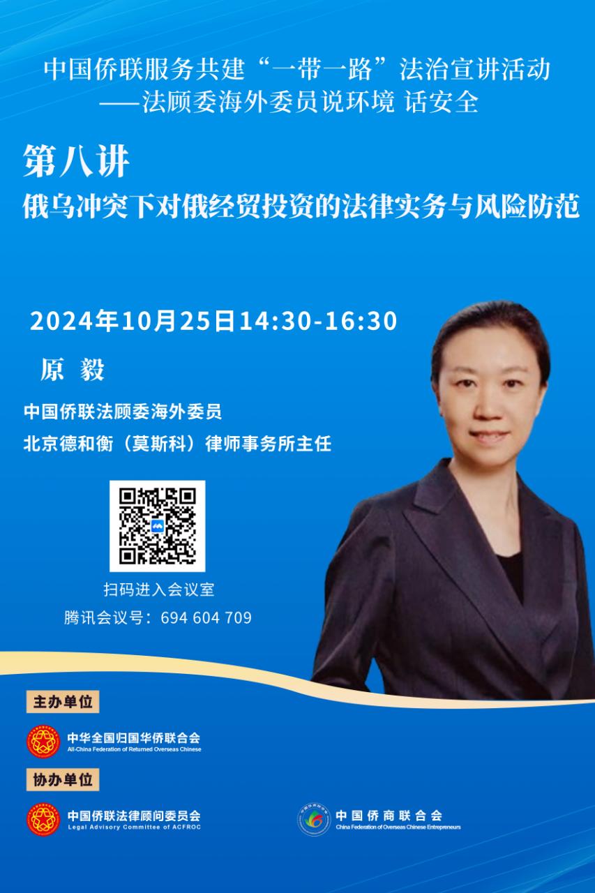第八講將于2024年10月25日(周五)14:30開播,由中國僑聯法顧委海外委員俄羅斯原毅律師主講。原毅律師是北京德和衡(莫斯科)律師事務所主任,俄羅斯莫斯科大學法律系博士研究生,在俄羅斯學習工作近三十年,擁有中國和俄羅斯律師資格,熟悉俄羅斯法律環境和在俄商業談判及管理運營模式,擔任中國駐俄羅斯大使館、新華社歐亞分社等多家政府機構、中資企業及商會在俄投資、貿易事務的法律顧問。原毅律師還是全國政協第十二屆三次會議海外列席代表、中國僑聯海外委員及法律顧問委員會海外委員、北京市政協海外工作顧問、中國政法大學國際教育部實務教學導師、俄羅斯中國和平統一促進會暨俄羅斯華僑華人聯合總會常務副會長、俄羅斯中國總商會法律行業分會執行會長、俄羅斯亞洲工業企業家聯盟副主席。