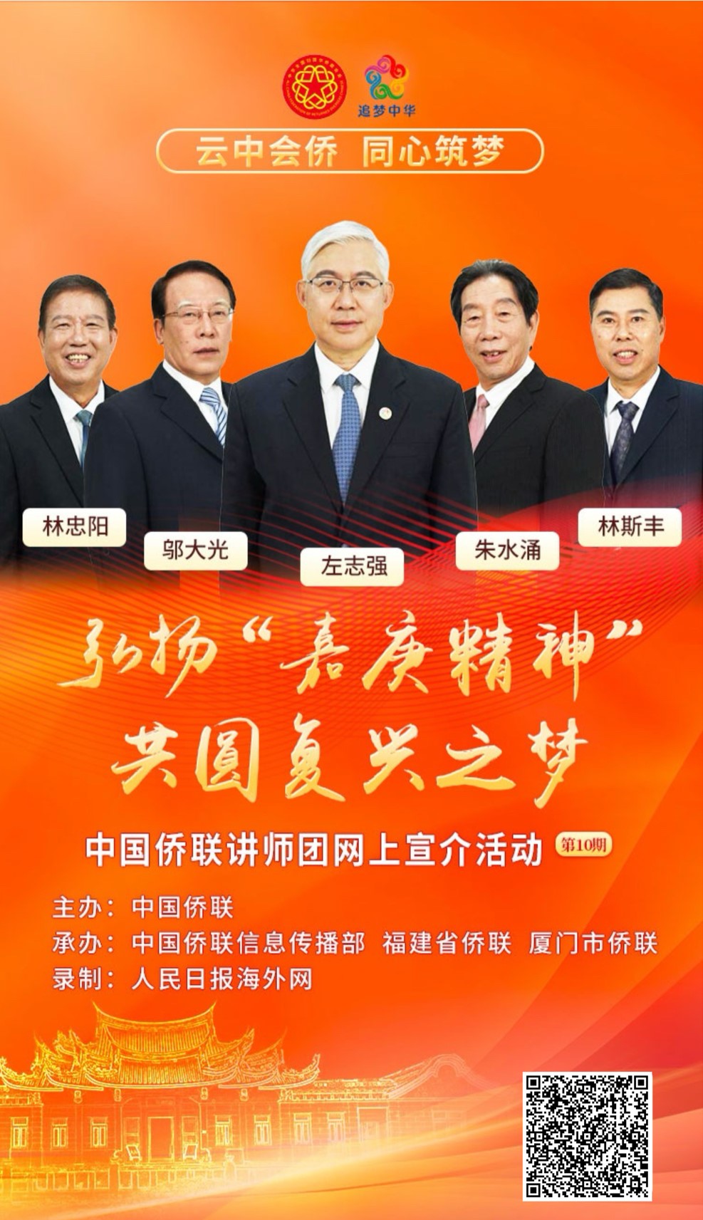 10月21日,以“弘揚‘嘉庚精神’ 共圓復興之夢”為主題的中國僑聯講師團(第十期)網上宣介活動視頻正式上線。視頻旨在深入學習貫徹習近平新時代中國特色社會主義思想和黨的二十屆三中全會精神,在陳嘉庚先生誕辰150周年之際,引導和鼓勵廣大歸僑僑眷和海外僑胞在新時代傳承弘揚“嘉庚精神”,凝聚僑心僑力僑智,積極參與到實現第二個百年奮斗目標的歷史進程中去,為實現中華民族偉大復興中國夢作出新貢獻。