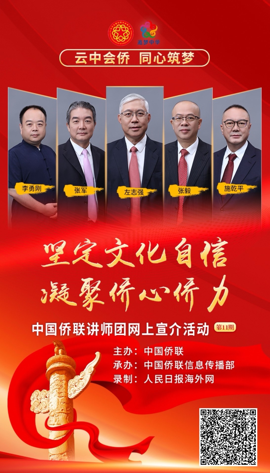 11月8日,以“堅定文化自信 凝聚僑心僑力”為主題的中國僑聯講師團(第十一期)網上宣介視頻正式上線。視頻旨在深入學習貫徹習近平文化思想,錨定建成文化強國的戰略目標,堅定文化自信,不斷發展新時代中國特色社會主義文化,不斷提升中華文化影響力,筑牢強國建設、民族復興的文化根基,激勵僑界群眾在奮進新征程中作出新貢獻。
