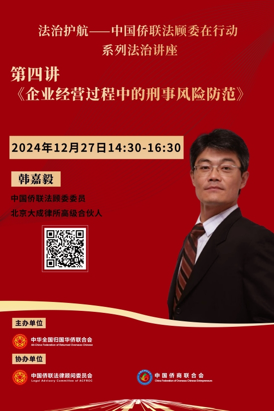 第四講將于12月27日(周五)14:30開播,由中國僑聯法顧委刑事專委會秘書長、北京大成律師事務所高級合伙人韓嘉毅律師主講,題目是《企業經營過程中的刑事風險防范》。聽課鏈接參見下方海報。
