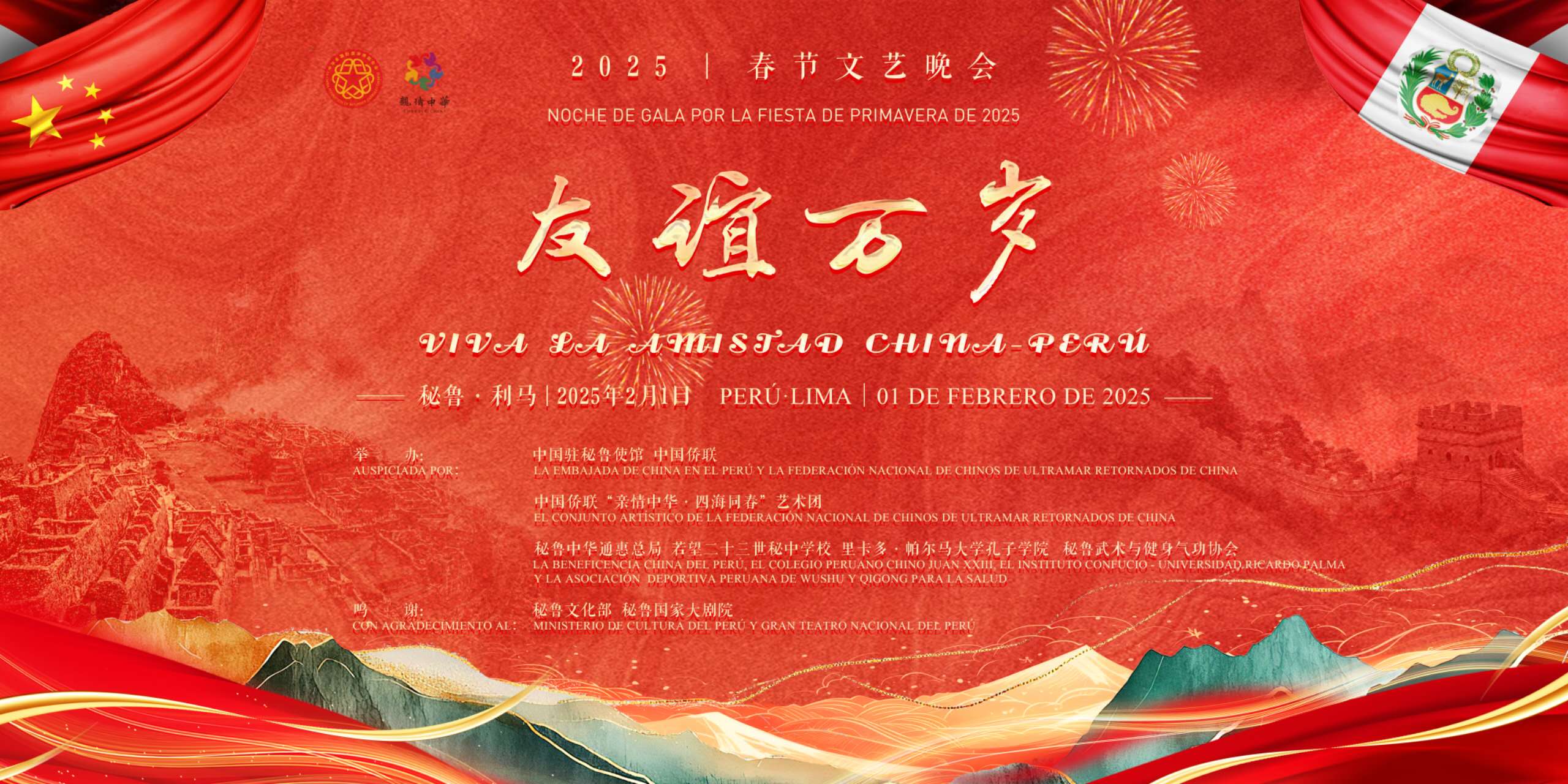 秘魯國會主席薩盧安納,中國全國人大社會建設委員會主任委員、中秘友好小組組長楊振武,中國駐秘魯使館臨時代辦次旺平措,秘魯國會秘中友好小組主席科爾德羅,秘魯外交部亞大司司長基羅斯,中國僑聯文化交流部副部長車壯麗出席活動并致辭。秘魯國會第一副主席華雷斯、第二副主席塞隆、外事委員會主席奧萬多等秘政要,文化界、商協會等各界友人,在秘華僑華人、中資機構代表及中外媒體等近1300人共同見證了這場友誼盛宴。