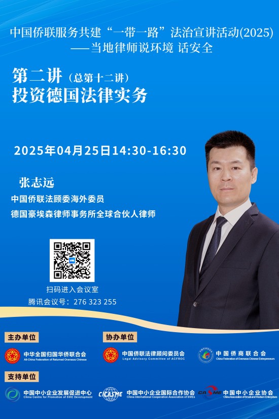 今年第二講(總第十二講)將于2025年4月25日(周五)14:30開播,由中國僑聯法顧委海外委員德國張志遠律師主講。張志遠律師先后畢業于中國政法大學和德國薩爾布呂肯大學、波恩大學,從2007年起擔任德國豪埃森律師事務所全球合伙人律師。張律師的專長是中歐企業雙向綠地投資、跨國并購、企業治理、企業合規及企業訴訟等。張律師還擔任中國駐德國大使館法律顧問,德國巴特洪堡應用科技大學客座法學教授,中國僑聯第三屆青年委員、第十屆和十一屆海外委員。