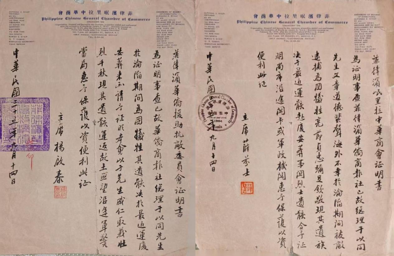 歷史文獻類:菲律賓華僑援助抗敵委員會發給《華僑商報》總理事于以同的珍貴證明書等;