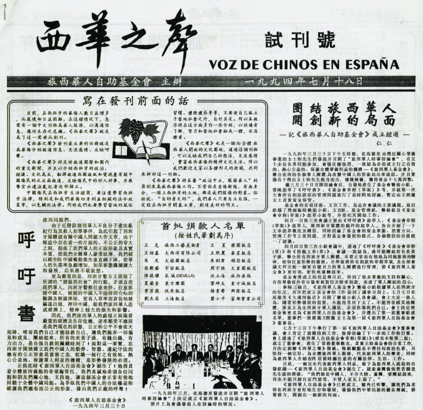 面對如此困境,西班牙各華僑華人社團團結一致,共同應對危機。他們主動致信與西政府首相和相關部門表達不滿,向發表不實報道的媒體發抗議信,并在當地報紙刊登反駁文章,取得了積極成效。在這一過程中,越來越多僑胞意識到辦一份中文報紙、發出自己聲音的重要性和必要性。1994年3月,50多位僑胞在馬德里召開“旅西華人時事討論會”,商議成立“旅西華人基金會”,隨后更名為“旅西華人自助基金會”?;饡Q定創辦《西華之聲》報,旨在“為全體旅西華人服務,代表旅西華人的聲音,同時為旅西華人介紹在西居留時應注意的有關法律、生活、工作事項”,并在是年7月18日發行了試刊號。