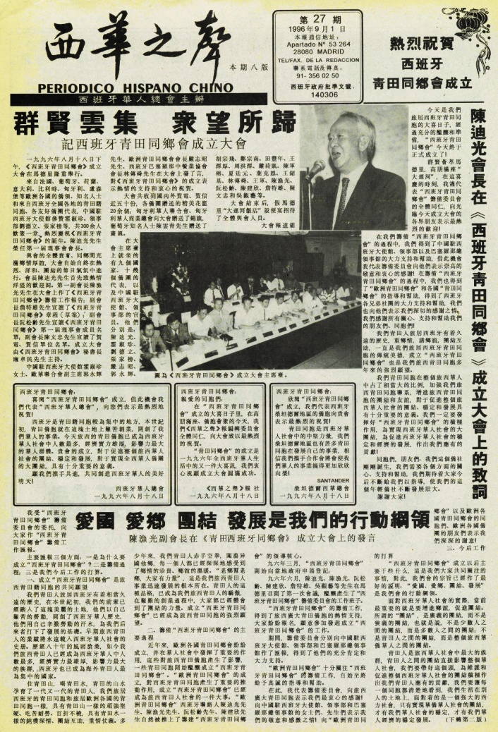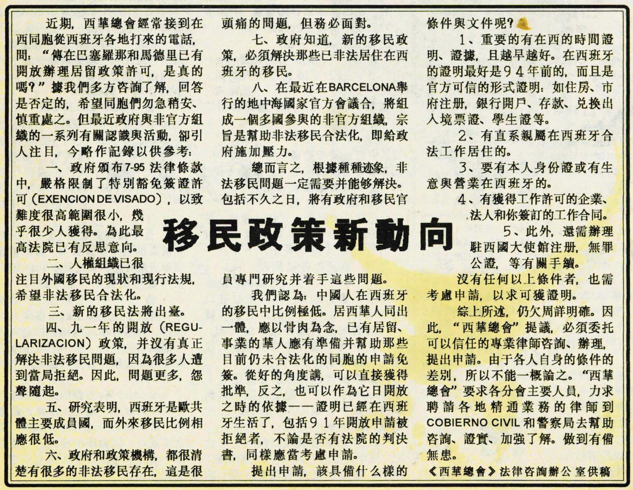 盡管存續時間不長,但《西華之聲》較為完整地記錄了西班牙華僑華人在二十世紀末快速發展進程中的熱點事件和重要節點,例如跟蹤報道牽動眾多中國移民心弦的“大赦”最新進展,以及每年初在頭版刊載上一年在西華人大事記。