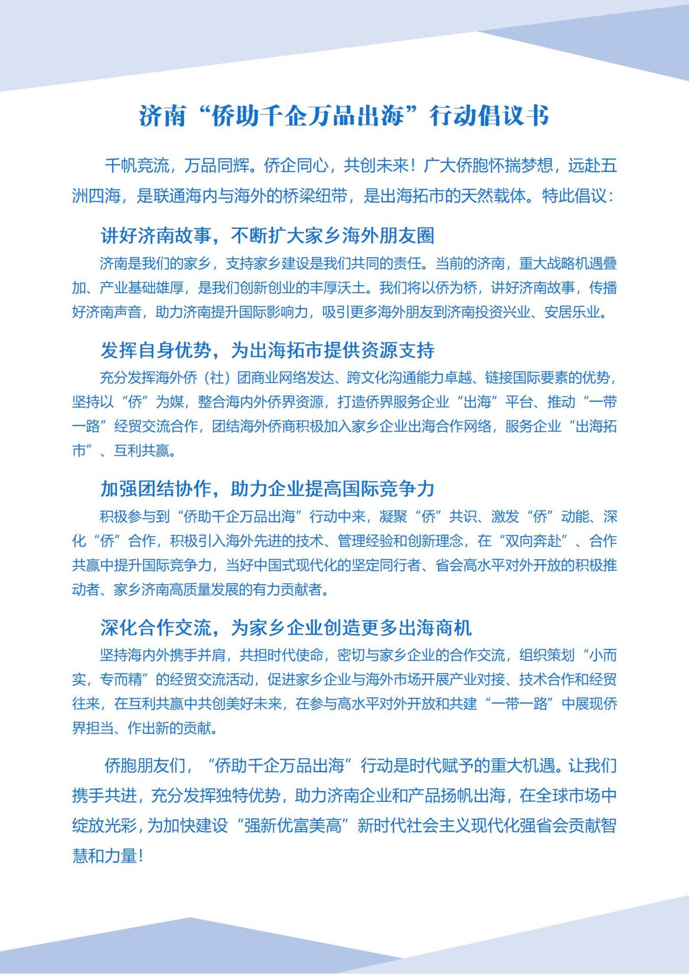 會上宣讀了《濟南“僑助千企萬品出?!毙袆映h書》。得到僑胞積極響應,紛紛表示將充分發揮海外僑(社)團資源豐富、人脈廣泛、鏈接國際要素的獨特優勢,積極參與到“僑助千企萬品出?!毙袆又衼?,以僑為橋、以內聯外,為助力省會高水平對外開放、開創強省會建設新局面作出新貢獻。