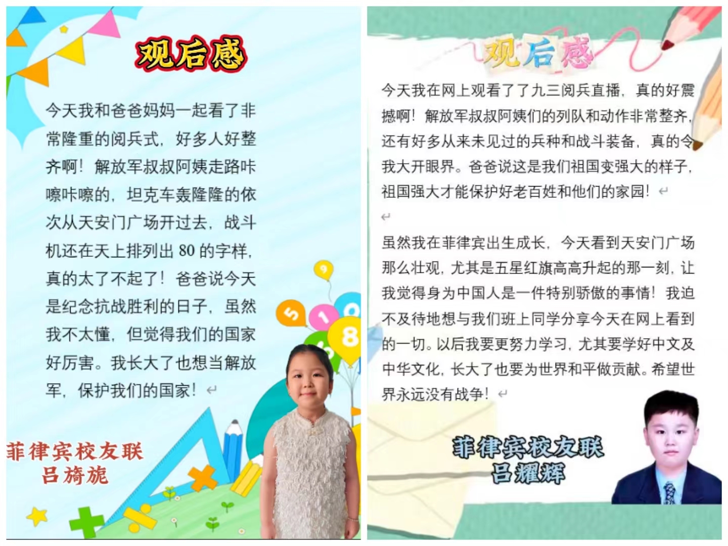 菲律賓校友聯營員施雅祺表示,今天隔著屏幕看完了九三閱兵,眼眶濕濕的。今天的中國不再是中文書里黑白照片的滄桑模樣,她眉宇間有風雷激蕩,步履中有山河回響。這份驕傲不需要翻譯,卻永遠能穿透所有距離與隔閡。當戰機劃過湛藍的天幕,我在評論區打下:“此生幸擁炎黃血,來生愿在種花家?!薄@或許就是海外華裔最真摯的告白,此刻耳邊依然回蕩著“正義必勝、和平必勝、人民必勝”!愿祖籍國繁榮昌盛,國泰民安!營員蔡瀚文表示,我們要謹記牢記初心、不負使命、守護和平、捍衛正義。作為海外華裔青少年,我們雖然身在異國他鄉,但祖國的歷史,我們將永遠銘記。我們愛您,偉大的祖國。我們愛您,英雄的人民。