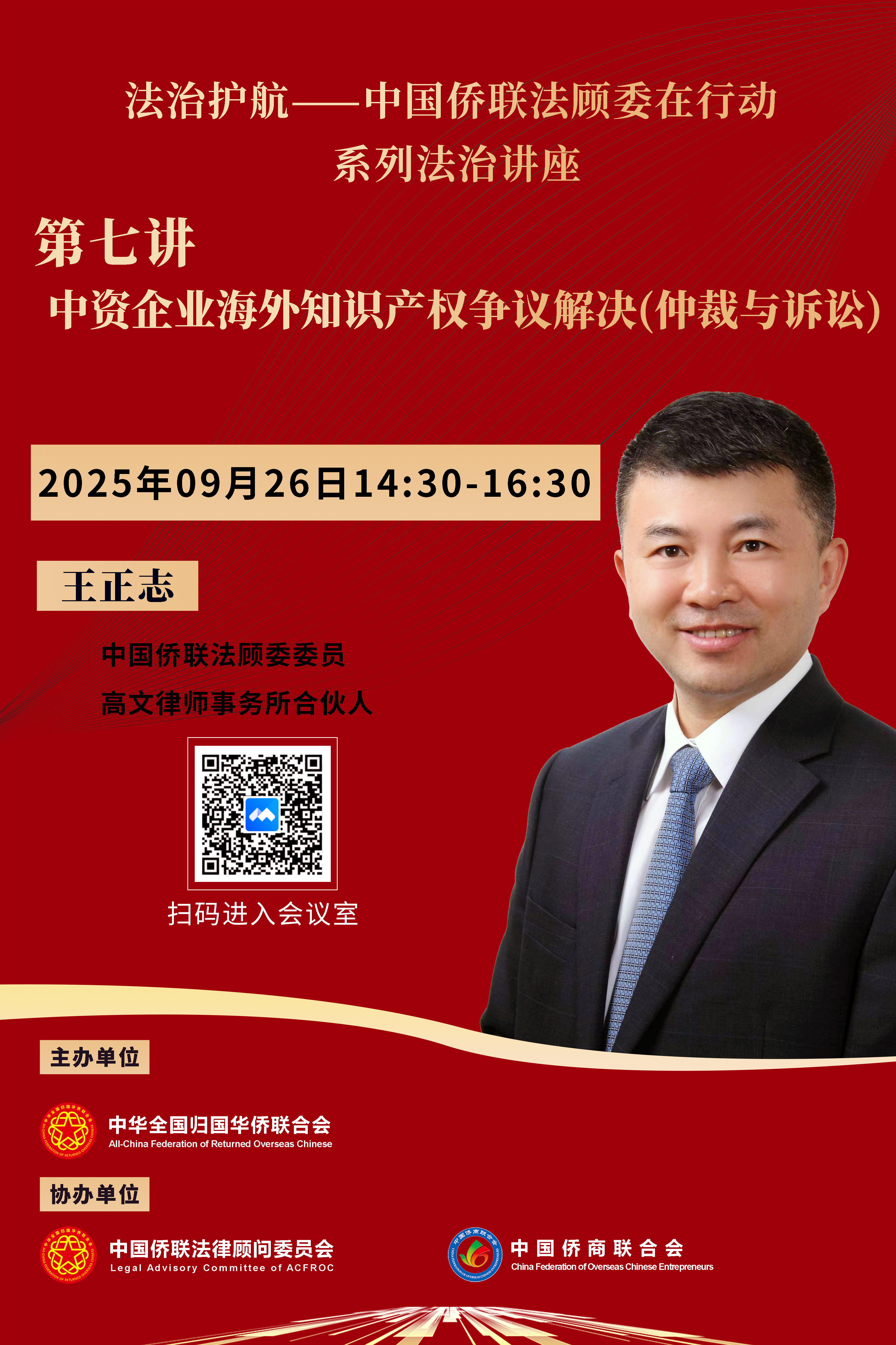 第七講將于9月26日(周五)14:30開播,由中國僑聯法顧委國際貿易與仲裁專委會委員、高文律師事務所合伙人王正志律師主講,題目是《中資企業海外知識產權爭議解決(仲裁與訴訟)》。聽課鏈接參見下方海報。