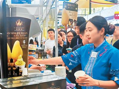 在東盟國家展區馬來西亞館,一款造型酷似榴蓮果肉的冰激凌成了“明星展品”,人們在“榴蓮大哥”品牌展位前排起長隊?!暗诙蝸頄|博會,展位大了一倍,人也多到忙不過來!”馬來西亞“榴蓮大哥”集團負責人吳聯波正忙著招呼顧客。